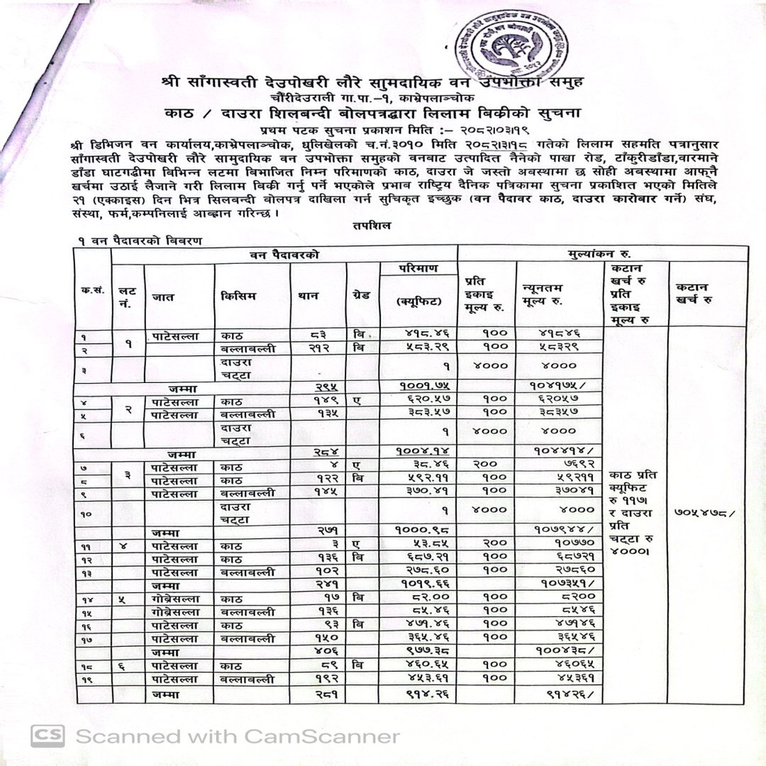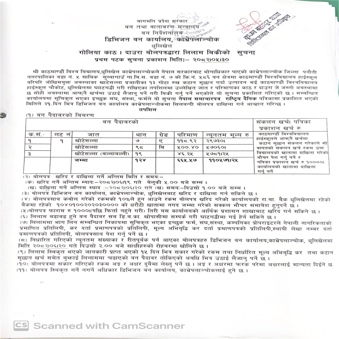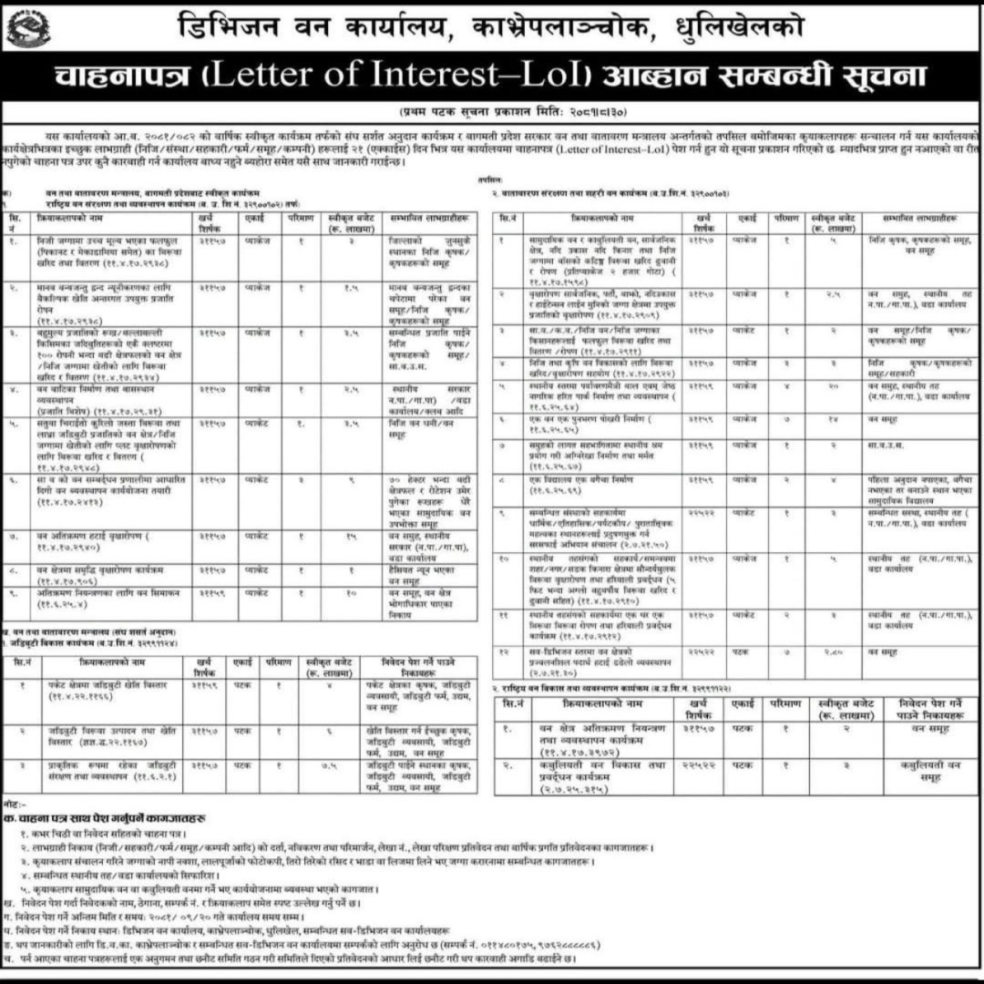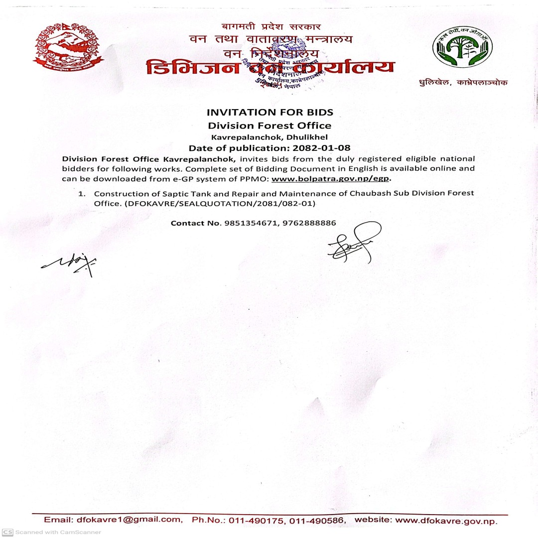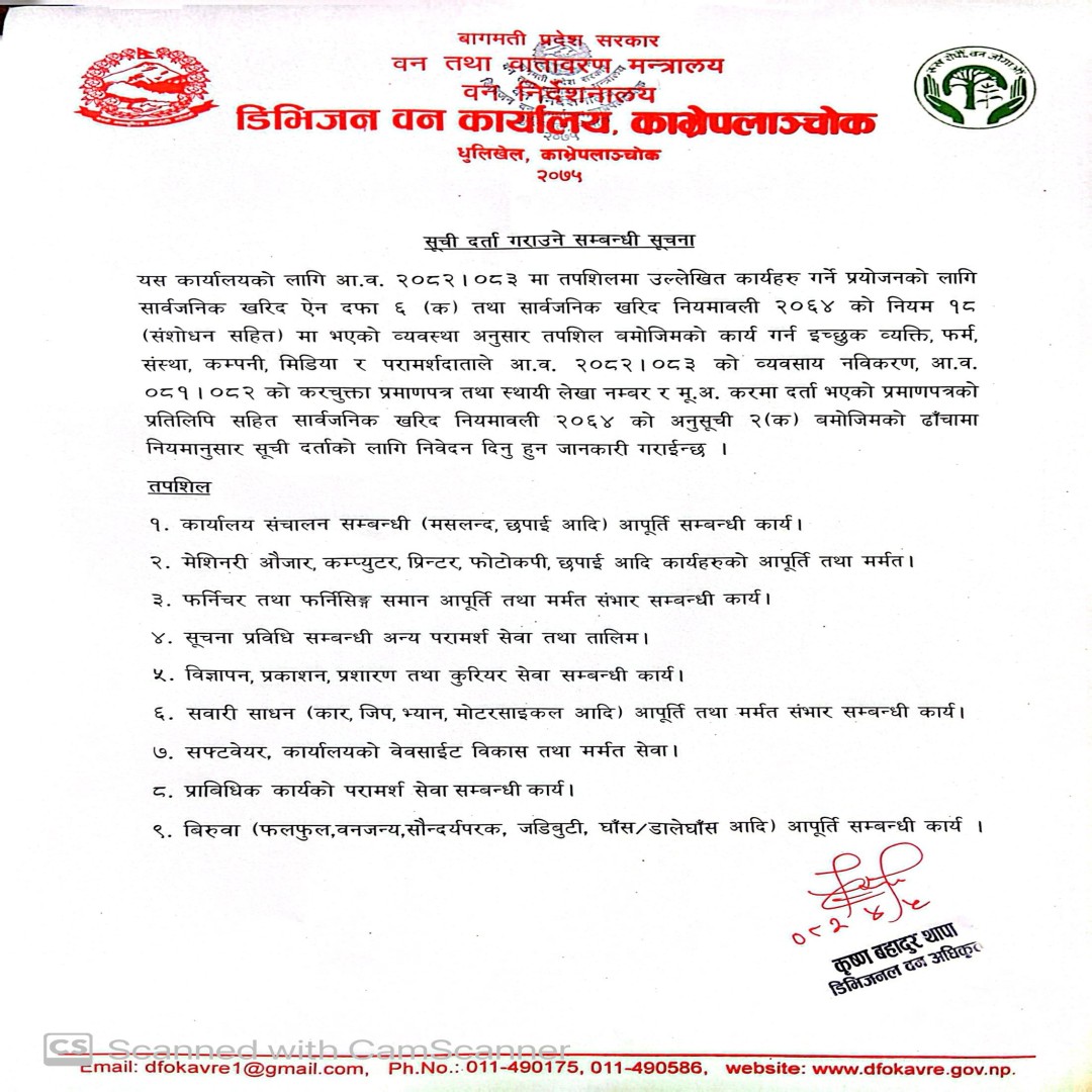 The Division Forest Office (DFO) Kavrepalanchok is a government body responsible for the management, conservation, and sustainable use of forest resources within the Kavrepalanchok district of Nepal. This office plays a critical role in preserving biodiversity, combating deforestation, and promoting reforestation in the region. It works under the guidelines of Nepal's Ministry of Forests and Environment and implements policies aime ...